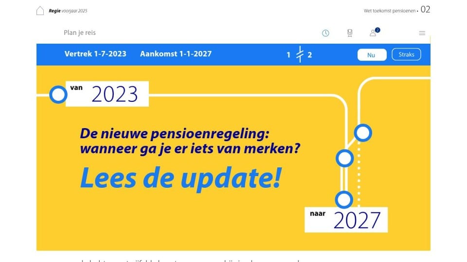 Er worden nog veel stappen gezet op weg naar de nieuwe regeling. In onderstaande tijdlijn zie je de stappen voor dit jaar op een rij. De ingangsdatum van de nieuwe pensioenregeling is 1 januari 2027.