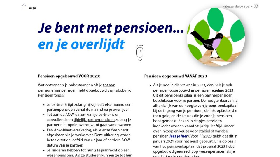 - Als je met pensioen bent en je hebt zowel voor als vanaf 2023 pensioen opgebouwd via Rabobank Pensioenfonds, dan ontvangen je nabestaanden een pensioen uit beide periodes.